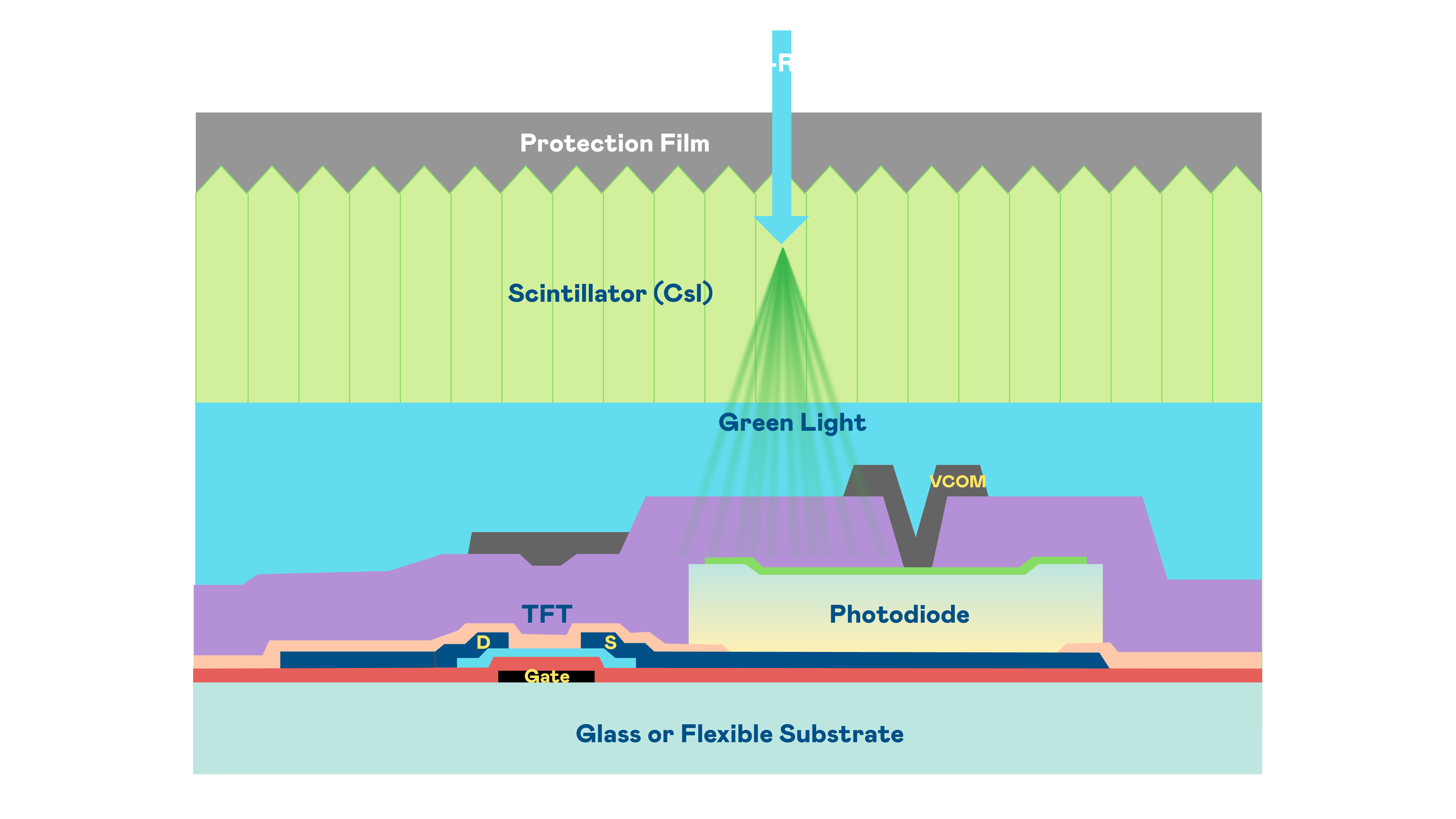 众腾娱乐的X光影像感测阵列使用薄膜电晶体 (TFT) 作为每个像素的读取开关,搭配光电二极体(Photodiode)的光电转换元件,用以感测X光影像讯号。